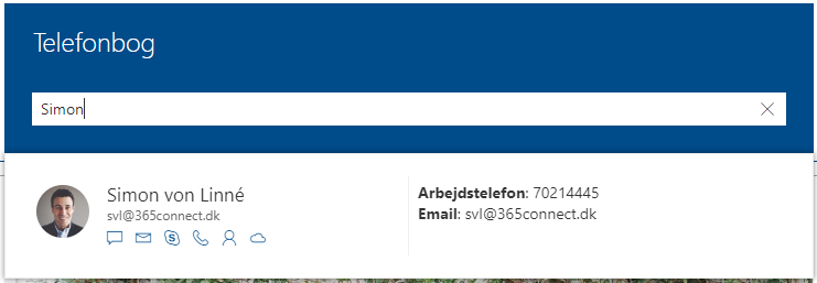 Såfremt din organisations modul er konfigureret til det, har du tilmed mulighed for at klikke på et af ikonerne i søgeresultatet for at få adgang til følgende handlinger; Send en besked over Teams, Send en e-mail over Outlook, Send en besked over Skype, Ring til arbejdstelefon, Gå til Delve profil eller Gå til Onedrive delt folder: